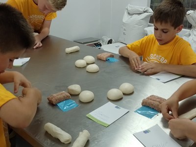 Maar dat was nog niet alles. Na een stuk fruit en de nodige bekers ranja later gingen we te voet op pad richting Heusden vesting. Terwijl de ene helft van de groep een speurtocht door Heusden deed, kreeg de andere helft een workshop worstenbroodjes maken bij Bakkertje Deeg. Er werd geconcentreerd gekneed en gevouwen en zo lagen er binnen no-time een stapel worstenbroodjes klaar om gebakken te worden. Ondertussen kregen we een interessante rondleiding door de bakkerij. Na anderhalf uur vertrok de ene groep met een zak vol worstenbrood en kon de tweede groep aan de slag met het worstenbrood.