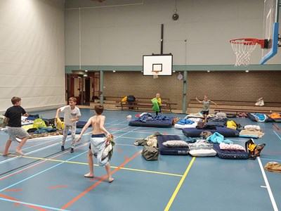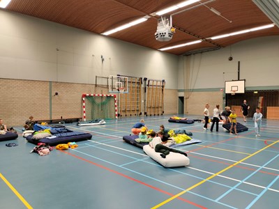 De dag zat er bijna op. De hal werd omgetoverd naar een grote slaapplek met overal luchtbedden en slaapzakken. Sportkleding werd gewisseld voor pyjama's. Bijna bedtijd, maar niet voordat er nog een leuke film was gekeken: Space Jam 2 stond op het programma! Na een flink kussengevecht gingen de lampen uit en werd het langzaamaan stil in de hal en nam de nachtwacht met Natasja, Alex, Hilko en Paul het toezicht over.
