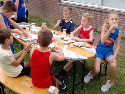 Om exact 7.30 uur klonk het gestuiter van een basketball weer door de hal. De kinderen werden langzaamaan wakker. Buiten stond een lekker ontbijt te wachten en toen bijna al het brood naar binnen was gewerkt kon worden begonnen aan de laatste training van dit weekend. Ernst en Björn gaven een leerzame training die uiteraard werd afgesloten met partijtje. En ondanks de korte nacht werd er fanatiek gespeeld.