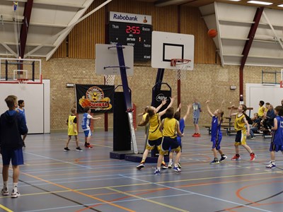 In de vroege zaterdagochtend kwamen ongeveer 75 basketballertjes onder de 10 jaar naar de sporthal voor het peanuts toernooi. Ze speelden onderling wedstrijden, toonden hun skills op het Race 4 Fun parcours en leefden zich uit op de stormbaan.