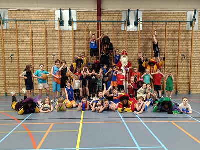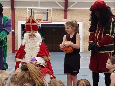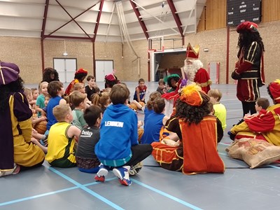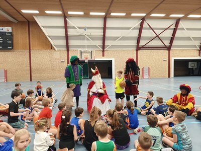 Er werd nog gezongen, gelachen, gerend en zelfs een partijtje gespeeld. Rond zessen was het tijd om afscheid te nemen van de Sint en zijn Pieten. Na een groepsfoto vertrok de goedheiligman onder luid gezang weer uit de sporthal.