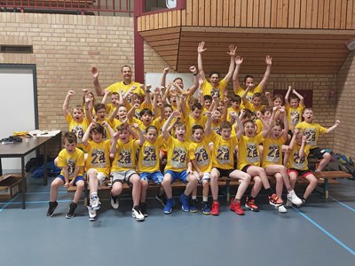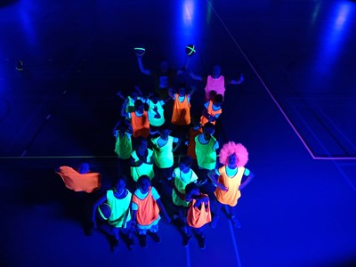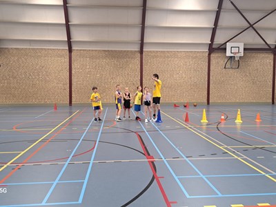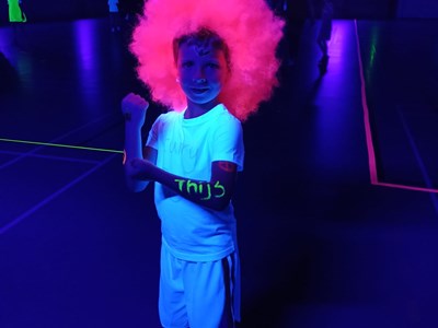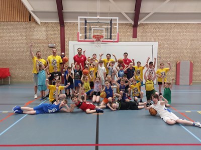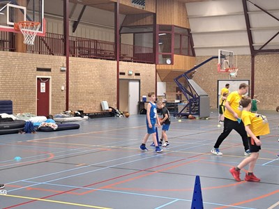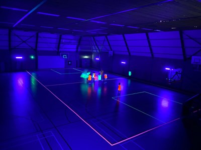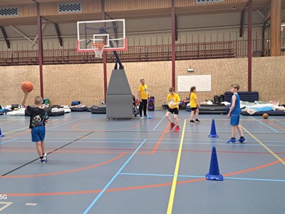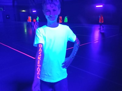 Intussen was de sporthal omgetoverd tot een lichtgevende arena! Het was tijd voor de verrassingsactiviteit: Glow in the dark basketball! Op twee velden konden de kinderen op een bijna magische manier basketballen. Het was een hele bijzondere ervaring die iedereen nog lang zal bijblijven.