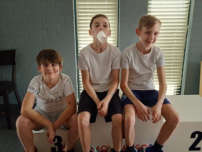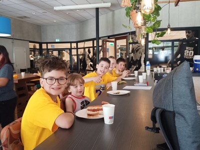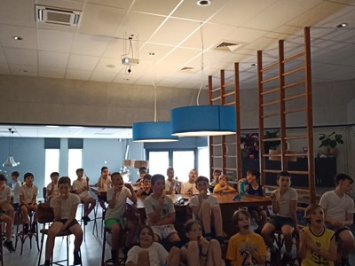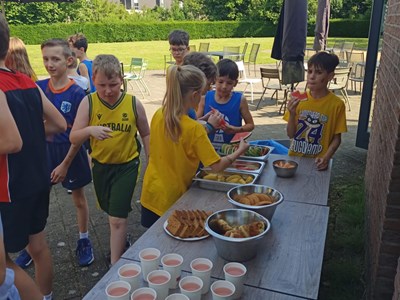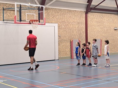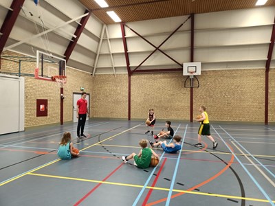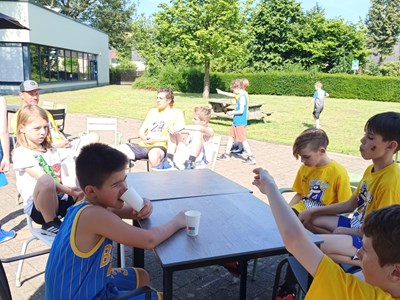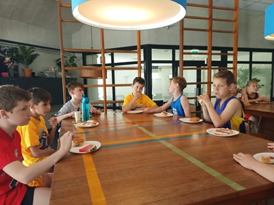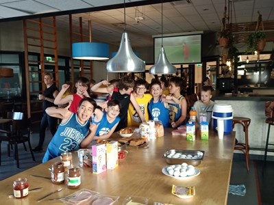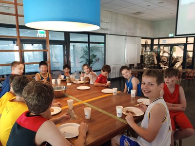 Inmiddels waren er behoorlijk wat calorieën verbrand die nodig moesten worden aangevuld. In de kantine stond gelukkig een stevige lunch klaar om de energie weer op peil te brengen. En niet alleen voor de spieren, maar ook voor de kleine breintjes. Want na de lunch werd hun basketball kennis flink getest bij de Grote Basketball Quiz! Niemand had de maximale score van 26 punten, maar het winnende team kwam met 24 punten toch aardig dichtbij!