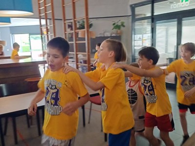 Nadat alles was opgeblazen en uitgepakt en alle ouders met veel lol waren uitgezwaaid, kon het kamp echt beginnen! De kampregels werden uitgelegd en iedereen kreeg een uniek kampshirt uitgereikt! Dit jaar in het teken van de legendarische nummer 24: Kobe Bryant!